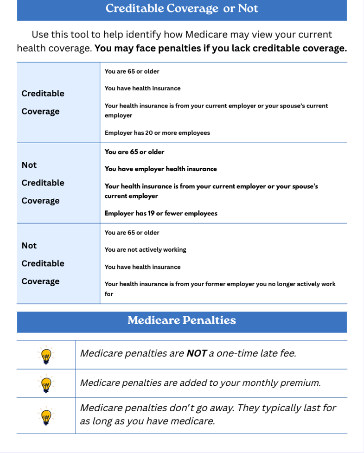 If you have creditable coverage when you become eligible for Medicare, you may delay enrolling without paying late enrollment penalties later.